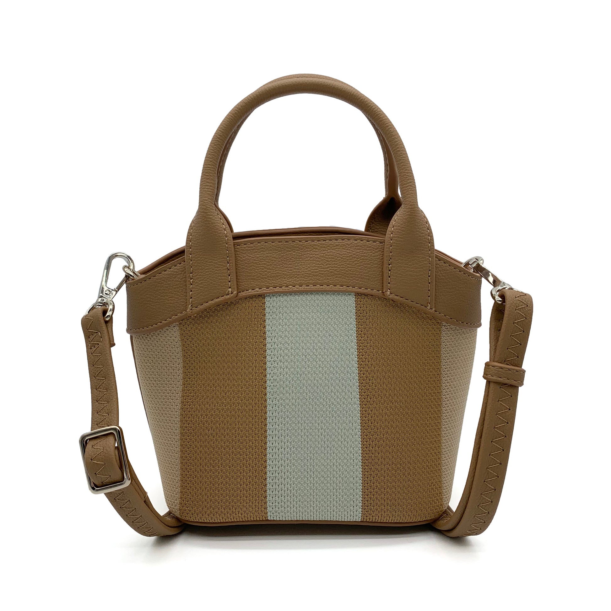 Elegant handbag made of fabric and polyurethane is characterized by the multi-colored striped pattern. Removable and adjustable shoulder strap.Ideal for always having your small accessories with you wallet, smartphone, house keys, makeup. Magnetic button closure worn over the shoulder and by hand. Colour Cream. Handle height: 8cm. Size 20L x 15H x 18D